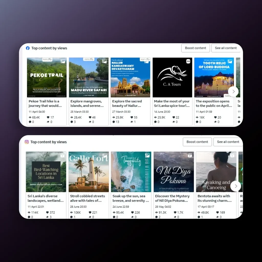 To build awareness and foster engagement, we implemented a targeted outreach strategy that focused on connecting with travel communities, Sri Lanka tourism groups, and niche audiences interested in visiting Sri Lanka. We actively engaged with followers by responding to inquiries, encouraging interactions, and sharing user-focused content that resonated with travelers.